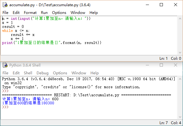 如果你的程序需要保留并重复使用,应该按Ctrl+N(或点菜单栏“File”>“New File”)新建一个.py文件来编写程序代码并保存到指定的文件夹,例如D:\Test\accumulate.py,然后按F5(或点菜单栏“Run”>“Run Module")执行这个文件,这是Python程序运行的标准模式。