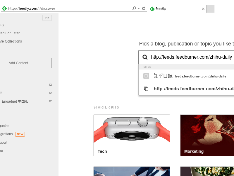 登录后点击左边栏的“Add Content”按钮,即可在文本框中输入RSS源的链接地址,例如: