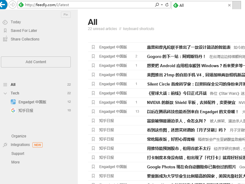 点击左边栏的“All”将显示你订阅的所有文章标题列表,点击标题查看文章内容:
