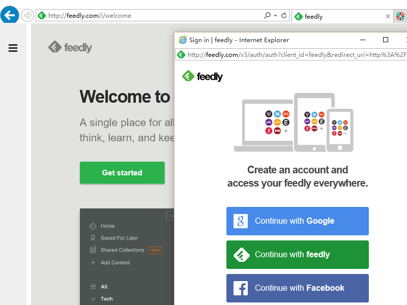 开始RSS生活,首先需要注册一个RSS阅读器账号,推荐使用网页版RSS阅读器Feedly(http://feedly.com/),在Feely主页上点击“Get started”按钮,选择“Continue with Feedly”,设定名字、邮箱和密码即可创建Feedly账号并登录(你也可以用Windows/Evernote/Google/Facebook/Twitter账号登录)。