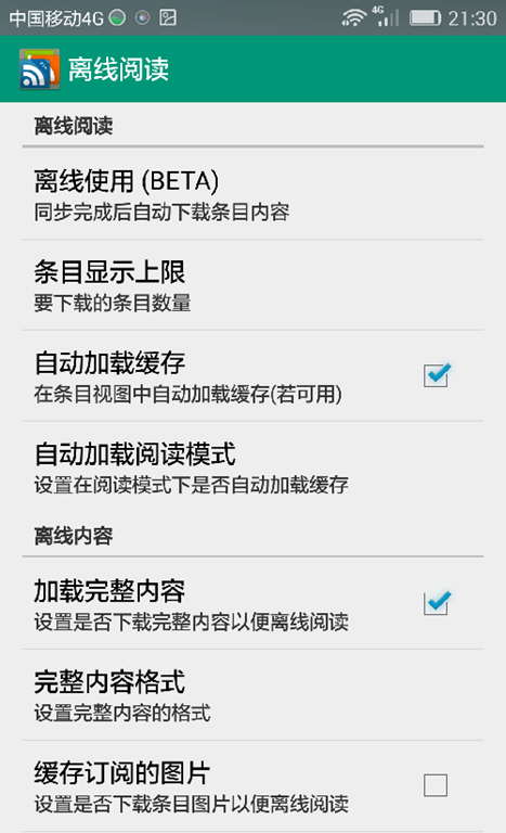 点击右上角菜单按钮可以选择打开设置界面,包括同步设置(如同步频率,同步星标条目、启动时同步等)和离线阅读设置(可以在有无线网络时先将订阅内容下载到设备的存储空间,不必随时消耗流量)