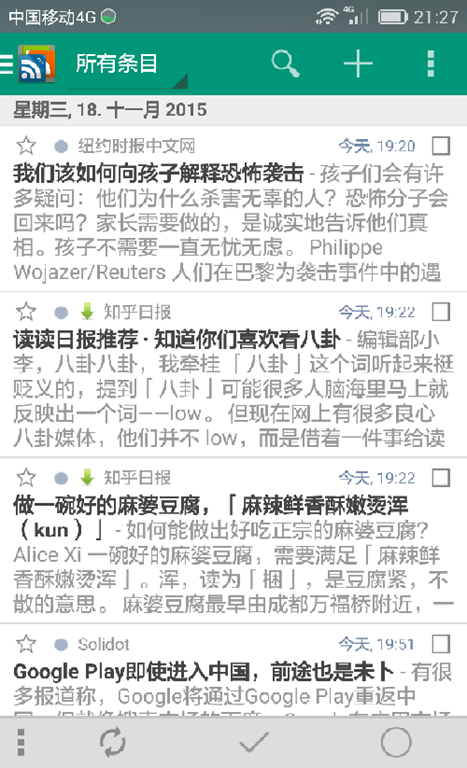 RSS阅读器也可以在手机、平板等移动设备上使用,并可以与电脑同步订阅内容。Android系统的设备上推荐安装gReader Pro(可以在这里下载),在iOS系统的设备上则可以使用Reeder,本篇介绍如何在Android手机上使用gReader Pro。