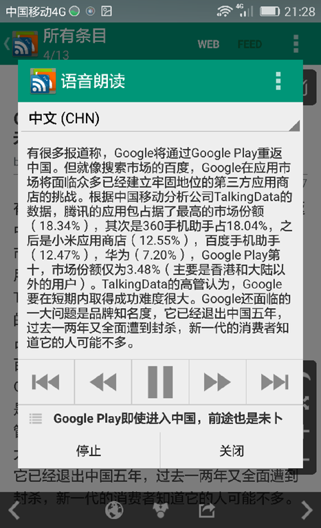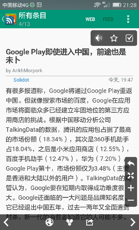 点击朗读按钮可以自动朗读文章,节省眼力(你的手机需要装有语音引擎):