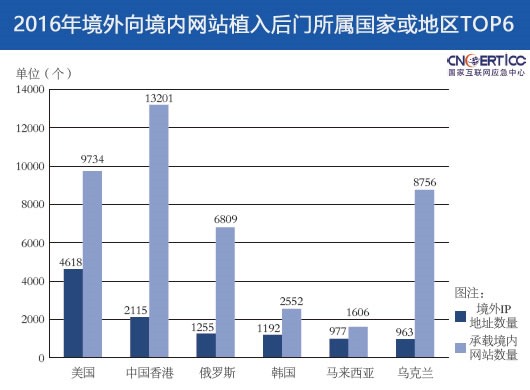 2016 年,CNCERT/CC 监测发现约 4 万个 IP 地址对我国境内 8 万余个网站植入后门,网站数量较 2015 年增长 9.3%。境外有约 3.3 万个(占全部 IP 地址总数的 84.9%)IP 地址通过向网站植入后门对境内约 6.8 万个网站进行远程控制。其中,来自美国的 IP 地址最多,占比 14.0%,其次是来自中国香港和俄罗斯的 IP 地址。从控制我国境内的网站总数来看,来自中国香港的 IP 地址控制数量最多,有 1.3 万余个,其次是来自美国和乌克兰的IP 地址,分别控制了 9734 个和 8756 个网站。